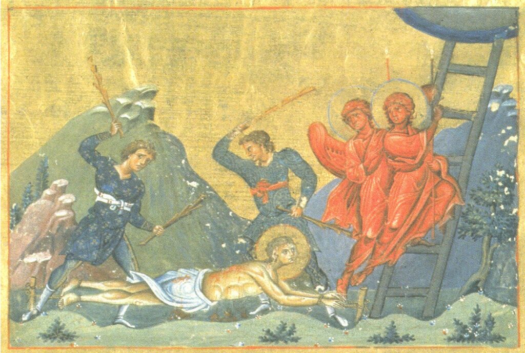 Το μαρτύριο του Αγίου Ανανία του Πέρση. Μικρογραφία από το Μηνολόγιο του αυτοκράτορα Βασιλείου του Β΄ (φ. 217).