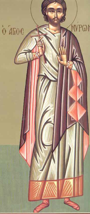 Ηρακλείου το άνθος το ευωδέστατον, ως ευσεβείας σε μύρον ύμνοις γεραίρομεν, νεομάρτυς του Χριστού Μύρων μακάριε. Συ γαρ νεότητος ακμήν υπερείδες ανδρικώς και ήθλησας στεροψ’υχως. Και νυν απαύστως δυσώπει, ελεηθήναι τας ψυχάς ημών.