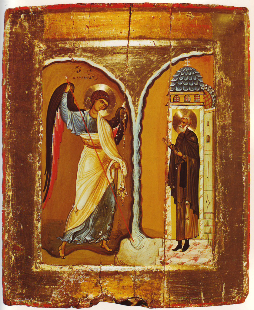 Ὡς νεφέλη ὠράθης ἐπισκιάζουσα, Μιχαὴλ Ταξίαρχα τῷ σῷ ἁγίω ναῶ, ὑετίζων δαψιλῶς ὕδωρ ἀθάνατον ὅθεν ὡς ἄλλη κιβωτόν, διεφύλαξας αὐτόν, καὶ ρείθρων τῶν ποταμῖων, τὸν ροῦν ἠκόντιαας πόρρω, πρὸς εὐφροσύνην τῶν ψυχῶν ἠμῶν.