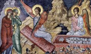 Αι Μυροφόροι γυναίκες, όρθρου βαθέος, επιστάσαι προς το μνήμα του Ζωοδότου εύρον Άγγελον, επί τον λιθον καθήμενον, και αυτός προσφθεγξάμενος, αυταίς ούτως έλεγε. Τι ζητείτε τον ζώντα μετά των νεκρών; τι θρηνείτε, τον άφθαρτον ως εν φθορά; απελθούσαι κηρύξατε, τοις αυτού Μαθηταίς.