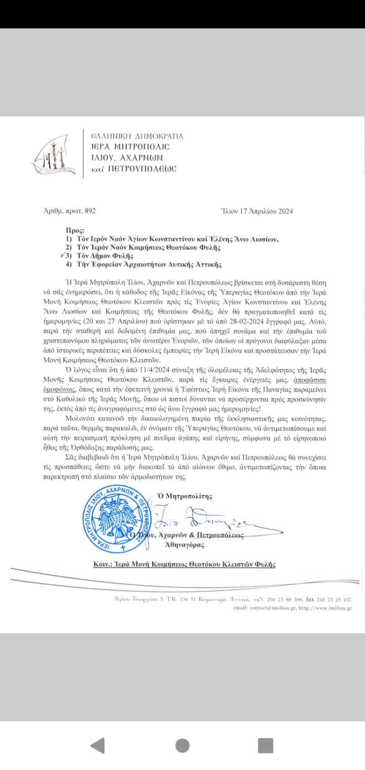 Δηλαδή είπαν να τηρείται μεν το έθιμο με την περιφορά δύο χρονιές, αλλά την τρίτη χρονιά, η εικόνα να παραμένει στο Μοναστήρι. Την ματαίωση της καθόδου της Εικόνας το 2024 γνωστοποίησε μάλιστα τότε με ανακοίνωσή του και ο Δήμος Φυλής, εκφράζοντας την απογοήτευσή του γιατί ενώ είχε ολοκληρώσει το σύνολο των προετοιμασιών για τις δύο κορυφαίες αυτές θρησκευτικές τελετές, αυτή τελικά δεν θα μπορούσε να πραγματοποιηθεί. (Θα έπρεπε τουλάχιστον το μοναστήρι να έχει ενημερώσει από νωρίς τον Δήμο, ώστε να μην προβεί σε προετοιμασία). Ο Δήμος ανέφερε επίσης πως το θέμα με την Εικόνα το διαχειρίζεται πλέον αποκλειστικά ο Μητροπολίτης Ιλίου, Αχαρνών και Πετρουπόλεως κ. Αθηναγόρας. (Και εδώ πρέπει να τονιστεί ότι ο Μητροπολίτης είναι επικεφαλής της Μητροπόλεως, αλλά δεν είναι ο ηγούμενος του Μοναστηριού, οπότε θα πρέπει να έρχεται σε συνεργασία και συνεννόηση με τους μοναχούς και τις μοναχές σε περιπτώσεις διαφωνιών ή και προβλημάτων).