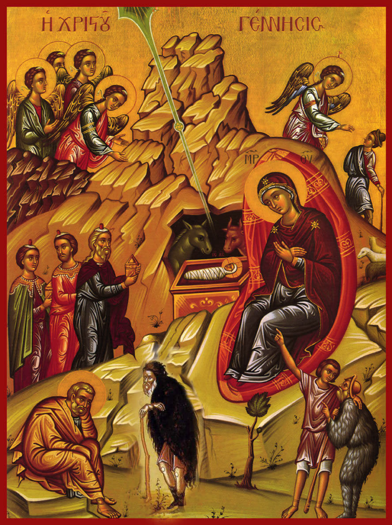 Κοντάκιον Ἦχος γ’. Αὐτόμελον. Ποίημα Ῥωμανοὺ τοῦ Μελῳδοῦ. Ἡ Παρθένος σήμερον, τὸν ὑπερούσιον τίκτει, καὶ ἡ γῆ τὸ Σπήλαιον, τῷ ἀπροσίτῳ προσάγει. Ἄγγελοι μετὰ Ποιμένων δοξολογοῦσι· Μάγοι δὲ, μετὰ ἀστέρος ὁδοιποροῦσι· δι᾽ ἡμᾶς γὰρ ἐγεννήθη, Παιδίον νέον, ὁ πρὸ αἰώνων Θεός.