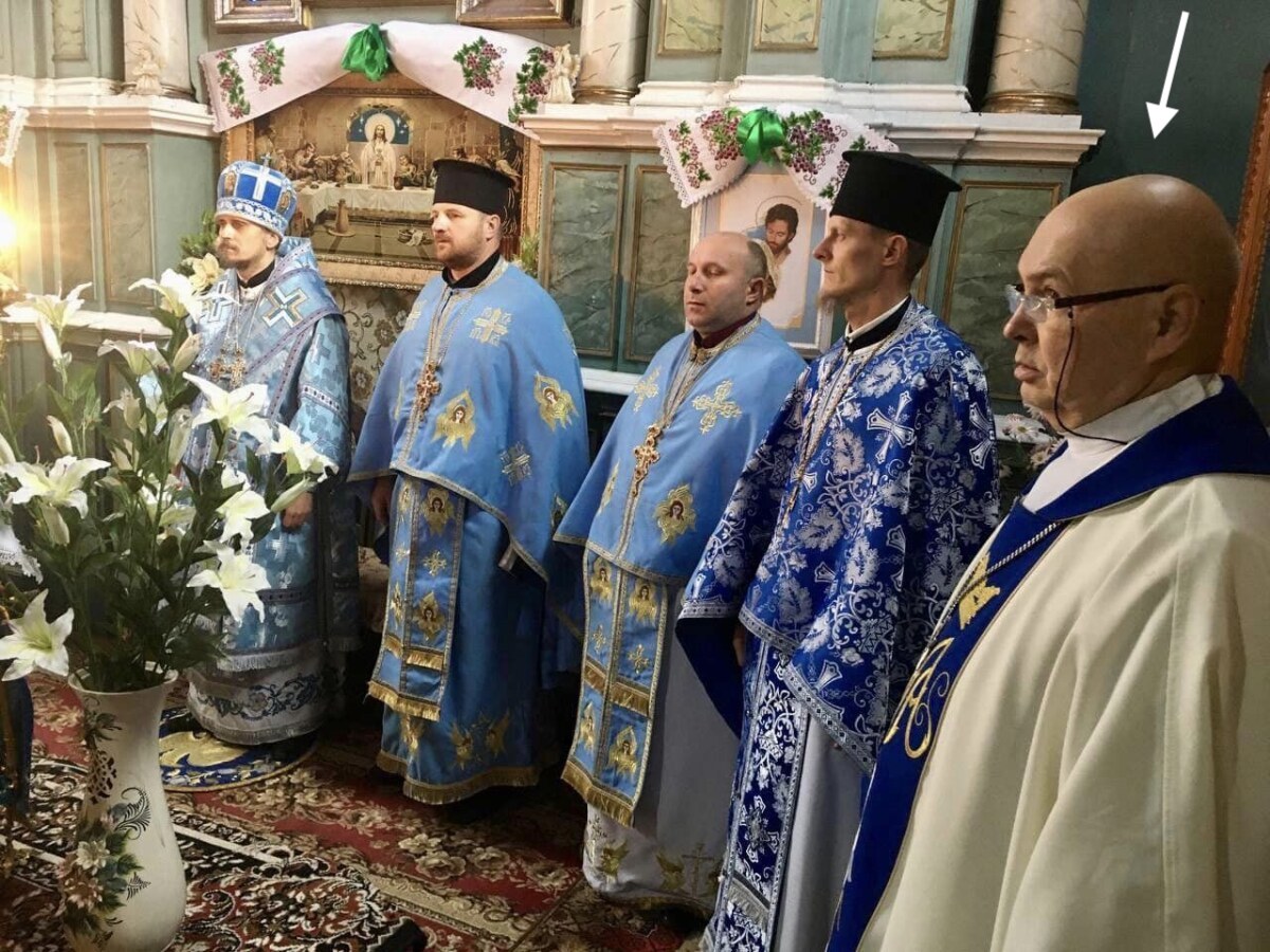 Σε αντίθεση με τις φωτογραφίες που δημοσιεύει η εν λόγω Επισκοπή, φαίνεται ο παπικός ψευδο-ιερέας να συμμετέχει κανονικά με άμφια στο μυστήριο της Θείας Λατρείας, αλλά και να ασπάζετε το ιερό ποτήριο επάνω στην Αγία Τράπεζα.