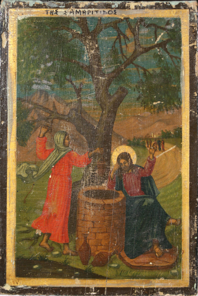 Εκεί ήταν η πηγή του Ιακώβ, το πηγάδι που εκείνος είχε ανοίξει. Κουρασμένος ο Κύριος από την οδοιπορία κάθισε μόνος του δίπλα από το πηγάδι και κάτω αφελώς, γιατί οι μαθητές του πήγαν να αγοράσουν τροφές. Έρχεται εκεί μια γυναίκα από τη Σαμάρεια να πάρει νερό και ο Κύριος διψώντας ως άνθρωπος, της ζήτησε νερό.