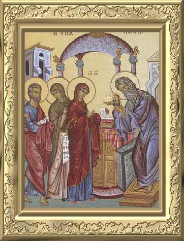 Σήμερον ἡ Πάναγνος Μαριάμ, τῷ Ναῷ προσάγει, ὥσπερ βρέφος τὸν Ποιητήν, ὃν ἐν ταῖς ἀγκάλαις, ὁ Πρέσβυς δεδεγμένος, Θεὸν αὐτὸν κηρύττει, κἂν σάρκα εἴληφε.
