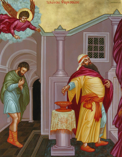 «Εἶπε δὲ καὶ πρός τινας τοὺς πεποιθότας ἐφ᾿ ἑαυτοῖς ὅτι εἰσὶ δίκαιοι, καὶ ἐξουθενοῦντας τοὺς λοιπούς, τὴν παραβολὴν ταύτην· ἄνθρωποι δύο ἀνέβησαν εἰς τὸ ἱερὸν προσεύξασθαι, ὁ εἷς Φαρισαῖος καὶ ὁ ἕτερος τελώνης. ὁ Φαρισαῖος σταθεὶς πρὸς ἑαυτὸν ταῦτα προσηύχετο· ὁ Θεός, εὐχαριστῶ σοι ὅτι οὐκ εἰμὶ ὥσπερ οἱ λοιποὶ τῶν ἀνθρώπων, ἅρπαγες, ἄδικοι, μοιχοί, ἢ καὶ ὡς οὗτος ὁ τελώνης· νηστεύω δὶς τοῦ σαββάτου, ἀποδεκατῶ πάντα ὅσα κτῶμαι. Καὶ ὁ τελώνης μακρόθεν ἑστὼς οὐκ ἤθελεν οὐδὲ τοὺς ὀφθαλμοὺς εἰς τὸν οὐρανὸν ἐπᾶραι, ἀλλ᾿ ἔτυπτεν εἰς τὸ στῆθος αὐτοῦ λέγων· ὁ Θεός, ἱλάσθητί μοι τῷ ἁμαρτωλῷ. Λέγω ὑμῖν, κατέβη οὗτος δεδικαιωμένος εἰς τὸν οἶκον αὐτοῦ ἢ γὰρ ἐκεῖνος· ὅτι πᾶς ὁ ὑψῶν ἑαυτὸν ταπεινωθήσεται, ὁ δὲ ταπεινῶν ἑαυτὸν ὑψωθήσεται». (Λουκ.18,10-14).