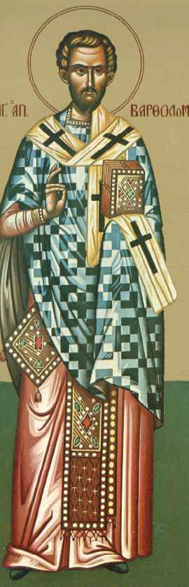 Ἐξ Ἐώας ὡς ὄρθρος ὤφθη πολύφωτος, ποντοπορήσασα ξένως Βαρθολομαῖε σοφέ, πρὸς τὴν Δύσιν ἡ σορὸς ἡ τῶν Λειψάνων σου, τοῦ γὰρ Ἥλιου τῆς ζωῆς, δαδουχεῖ τᾶς δωρεᾶς, καὶ σκότος παντοίων νόσων, ὁλοσχερῶς διαλύει, τῶν προσιόντων ταύτη πάντοτε.