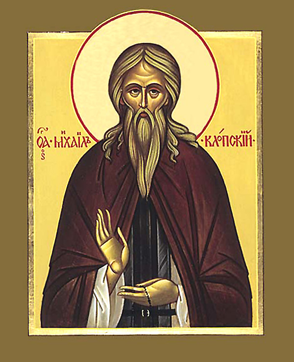 Ο Όσιος Μιχαήλ έζησε στην Ρωσία και καταγόταν από πλούσια οικογένεια. Ήταν διά Χριστόν σαλός, για να αποκρύψει τις αρετές του από τον κόσμο και να αποφεύγει τον έπαινο των ανθρώπων. Μόνασε στη Μονή Κλοπς του Νόβγκοροντ της Ρωσίας και κοιμήθηκε με ειρήνη το 1456 μ.Χ. το σκήνωμά του ενταφιάσθηκε στη Μονή Κλοπς.