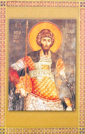 Ἀνδρεία ψυχῆς, τὴν πίστιν ὀπλισάμενος, καὶ ρῆμα Θεοῦ, ὡς λόγχην χειρισάμενος, τὸν ἐχθρὸν κατέτρωσας τῶν Μαρτύρων κλέος Θεόδωρε, σὺν αὐτοὶς Χριστῷ τῷ Θεῷ, πρεσβεύων μὴ παύση ὑπὲρ πάντων ἠμῶν.