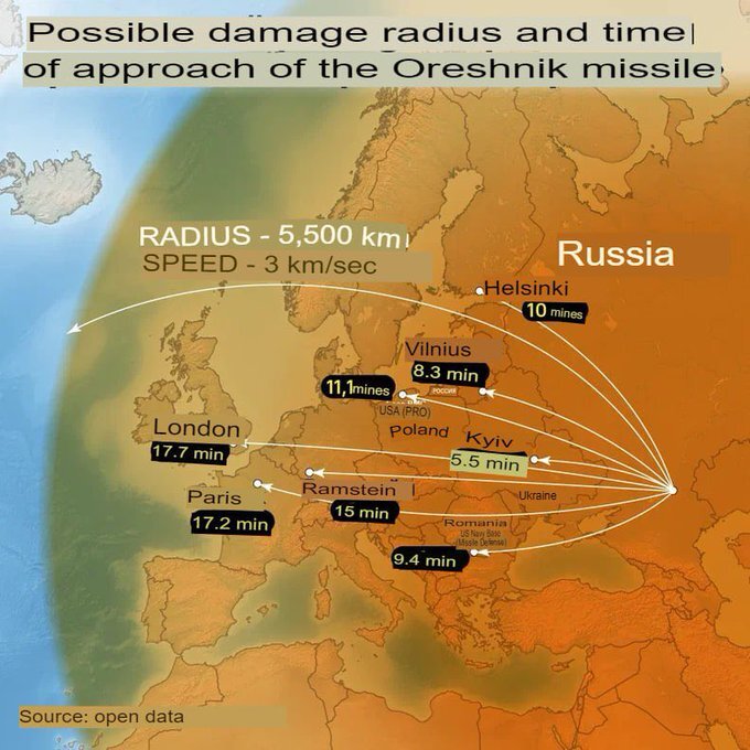 H Mόσχα εξέδωσε χάρτη που κοινοποιεί την ταχύτητα (12.250 χλμ./α/ώ.)του διηπειρωτικού βλήματος RS-26 Oreshnik και τους χρόνους άφιξής του στους βασικούς στόχους του στην Ευρώπη, που έχουν ως εξής: