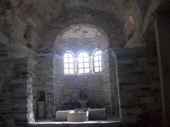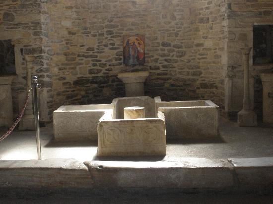 Στη νότια πλευρά του μεγάλου ναού, βρίσκεται το βαπτιστήριο του 4ου αιώνα, το αρχαιότερο και καλύτερα διατηρημένο βαπτιστήριο σε όλη την ορθόδοξη ανατολή. Στο βαπτιστήριο υπάρχει η παλαιότερη τοιχογραφία από όσες βρέθηκαν στο νησί. Είναι του 11ου – 12ου αιώνα και εικονίζει τον Άγιο Γεώργιο. Το Βαπτιστήριο έχει σκαλιά και βαθμίδες έτσι ώστε να χωράει μέσα από το ποιό μικρό μωρό, έως τον ποιό εύσωμο και ενήλικο άνδρα, κάτι το οποίο μαρτυρεί το ότι η Ορθόδοξος Εκκλησία, από τους πρώτους αιώνες, εφάρμοζε κατ’ ακρίβειαν τις τρείς καταδύσεις και αναδύσεις ΕΚ ΤΟΥ ΎΔΑΤΟΣ εις το Βάπτισμα, έτσι ώστε να βαπτίζεται όλο το σώμα και όχι το μισό, ή δια επιχύσεως ύδατος στο κεφάλι, όπως δυστυχώς βλέπουμε να γίνεται σήμερα σε αρκετούς ναούς στα πλαίσια της εκκοσμικεύσεως του κλήρου και του λαού, αλλά και από τον επηρεασμό του Οικουμενισμού…