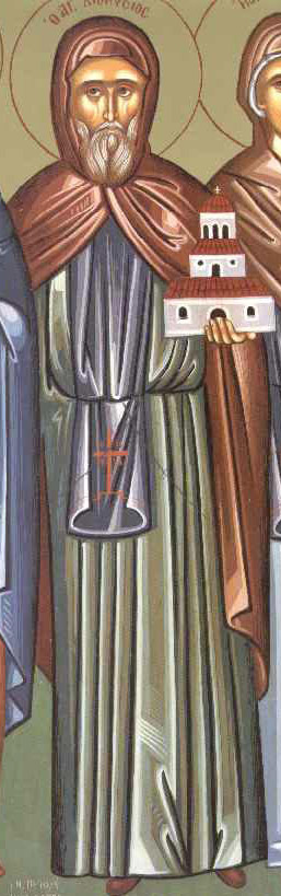Φῶς οὐράνιον, ἐν σοῖ σκηνώσαν, λύχνον ἄσβεστον, τοὶς ἐν τῷ Ἄθῳ, Διονύσιε σαφῶς σὲ ἀνέδειξε, σὺ γὰρ Προδρόμου τὸν βίον μιμούμενος, Μονὴν αὐτῶ ἀνεγείρεις περίβλεπτον. Πάτερ Ὅσιε, Χριστὸν τὸν Θεὸν ἱκέτευε, δωρήσασθαι ἠμὶν τὸ μέγα ἔλεος.