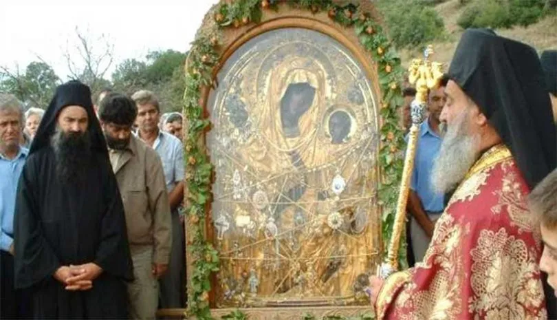 Μια βραδιά, εκείνο το έτος, λοιπόν, καθώς περνούσε και πάλι μπροστά από την εικόνα της Θεοτόκου, ακούει φωνή να βγαίνει από την εικόνα και να του λέει: “Να μην ξαναπεράσεις από εδώ με δαδιά καπνίζοντας την εικόνα μου”. Ό μοναχός νομίζοντας ότι κάποιος άνθρωπος φώναξε, καταφρόνησε τη φωνή και δεν έδωσε σημασία. Μετά από λίγες ημέρες, κι ενώ εκείνος συνέχιζε να περνάει μπροστά από την εικόνα με αναμμένα τα δαδιά, ακούει και πάλι τη φωνή να του λέει: ‘”Ώ Μοναχέ αμόναχε, έως πότε θα συνεχίσεις να καπνίζεις τη μορφή μου και να με μαυρίζεις ατιμώντας με;”. Και συγχρόνως με τη φωνή έχασε ο ταλαίπωρος το φως του κι έμεινε τυφλός.”
